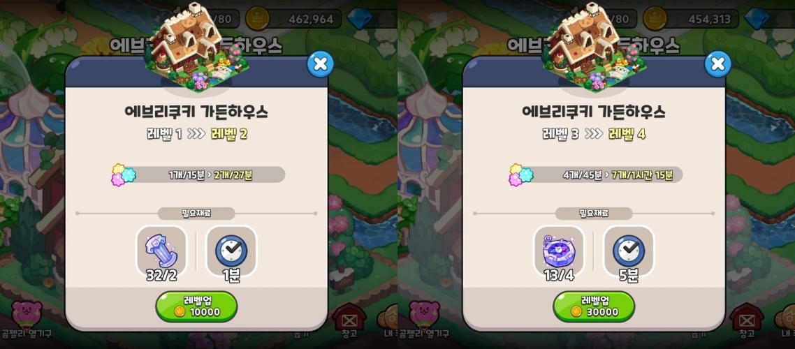 에브리쿠키 가든하우스의 크키는 랜드마크와 같은 크키로 상당히 커요! 그러니 설치하기 전에 공간을 만들어 주셔야해요.그리고 일반 쿠키하우스에서는 경험의 별사탕 레벨1을 준다면, 에브리쿠키 가든하우스는 경험의 별사탕 레벨2를 줘요!