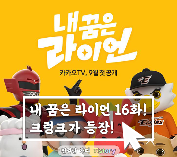 9월부터 카카오 TV에서 스트리밍 하고 있는 '내 꿈은 라이언'을 아시나요? 아띠는 요즘 재미나게 보고 있는 프로인데요. 마스코트들이 연예인 이상으로 인기를 끌고 있죠. 대표적으로 펭수, BT21, 어피치, 라이언 등이 생각나는데요. 내 꿈은 라이언은 전국에 있는 수~~많은 아직 뜨지 못한 마스코트들이 세계 최초의 마스코트 종합학교에 입학해서 펼치는 도전을 그린 작품입니다.
