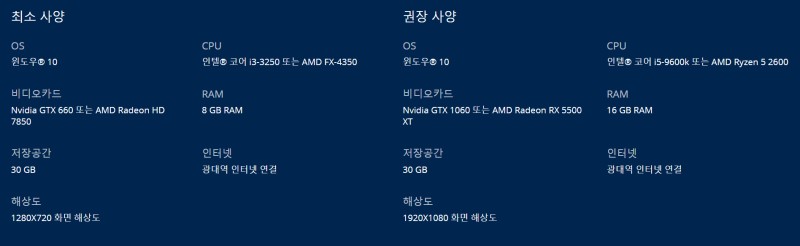 시스템 최소사양,권장사양은 현존 pc 시장 스펙을 생각하면 굉장히 준수한 편 이니 발적화로 나오지만 않는다면 컴퓨터 사양 문제로 못 즐기는 일은 없을 것 같습니다. 권장사양 지포스 1060 인데. 사이버펑크 덕분에 다들 쌩쌩 돌릴 수 있을거 같내요!