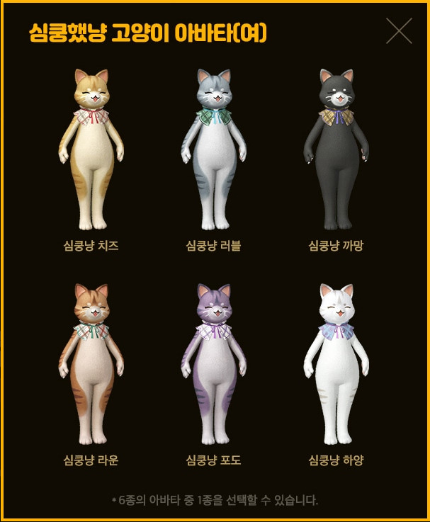 도전 출근왕으로 스탬프를 50개 받으면 '심쿵했냥 고양이 선택 상자' 를 받을 수 있는데. 남캐 여캐로 나뉘어 있습니다. 디자인을 보면 남캐는 모자를 쓰고, 여캐는 목에 리본을 하고 있으며, 남캐의 털은 검정색을 여캐는 하얀색으로 표시 되고 있는 것을 확인 할 수 있습니다.