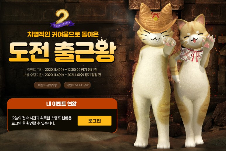 두근두근 추억의 뽑기판을 통해 '외형변경권' 도 획득이 가능하며, 주말 핫타임 이벤트도 진행이 됩니다. 고양이 아바타를 획득 가능했던 출근왕과 또 다른, 그냥 출석체크만 하면되는 출석역시 2주년 보상에 걸맞게 진행이 되고 있습니다.