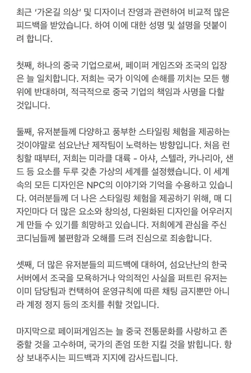 이렇듯 게임 개발/ 운영을 하는 페이퍼게임즈는 중국 공산당이 지지하는 하나 된 중국을 지지하며, 다른 나라의 문화나 전통 따위는 개나 줘 버리고, 중국이 하는 말이 다 옳으며, 한복 역시 중국의 전통이고 중국의 존엄을 지킬 것이라는 것을 웨이보로 공식 발표하게 됩니다.