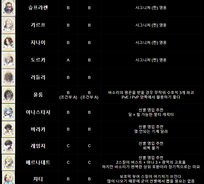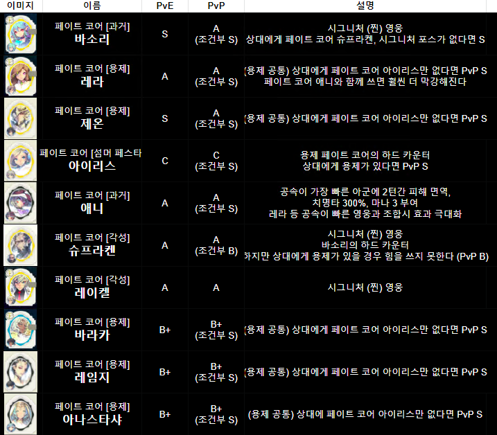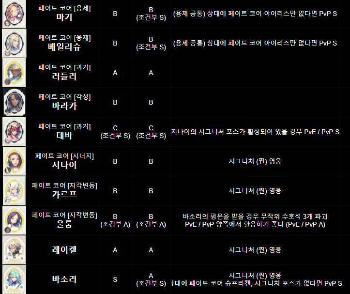 바소리(페코/과거)는 상대에게 페이트 코어 슈프라켄, 시그니처 포스가 없다면 pvp에서도 S 등급되는 조건부를 가지고 있습니다. PvE에서는 당연 S급으로 최고의 성능을 발휘합니다.