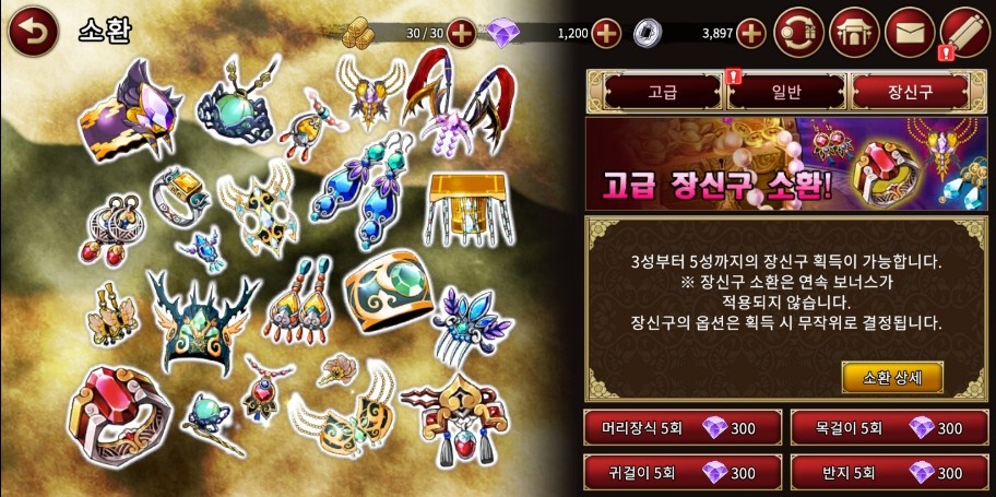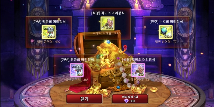 장신구는 300 휘석당 5회 뽑을 수 있으며, 3~5성까지 존재합니다. (별)