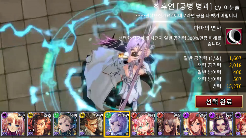 2. 처음 군주 선택을 진행하게 되는데. 여러분이 좋아하는 삼국지의 영웅 또는 구상해두셨던 조합에 맞춰서 선택해주세요. 처음 선택한 군주는 당연히 10연뽑에서 1개로 선택되어 나옵니다. (SR등급)