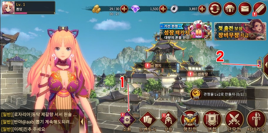 1. 메인에서 하단 '소환'을 누르시면 고급뽑기 / 일반뽑기 / 장신구 뽑기를 할 수 있습니다.