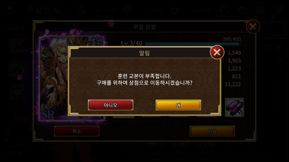 게임을 하시다보면 장수들의 레벨업이 쉽지 않아서 스토리를 계속 돌리거나, 선착장 강적 출현을 돌리게 될 겁니다. 플레이시 얻게 되는 훈련 교본들은 정말 키워야할 장수를 위해 아껴두셨다가 사용하시는게 현명합니다. 이렇게 해도 핵과금러 아니면 훈련 교본이 부족해서 정체하는 순간이 옵니다.