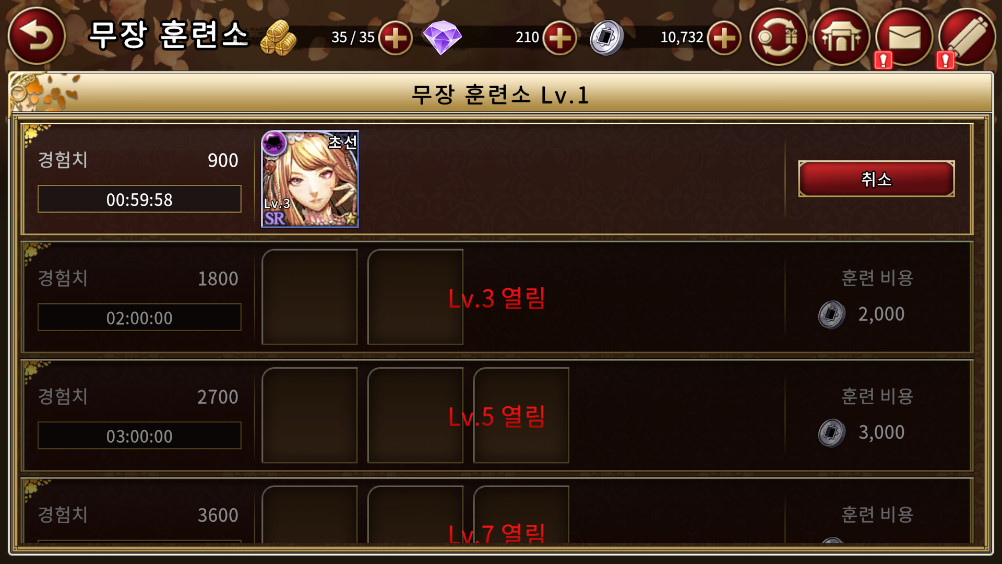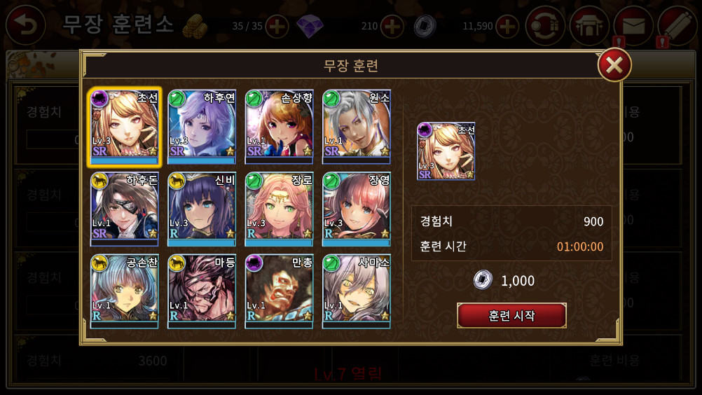초반 게임 진행시 영지에 훈련소를 건설하시게 되는데. 훈련소는 시간마다 장수를 훈련 시켜서 경험치를 얻을 수 있으니, 매 시간마다 돌려주시는게 좋습니다.
