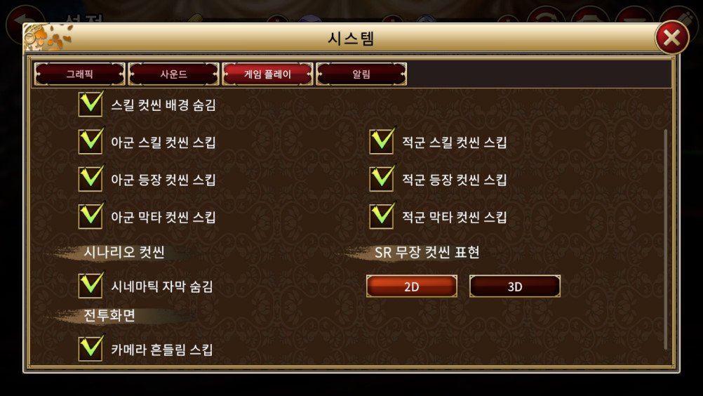 아군, 적군 등장, 스킬, 막타 컷씬을 모두 스킵으로 하시면 전투 진행시 깔끔한 화면으로 플레이가 가능합니다. 조금 과장하면 코에이 삼국지11 ~ 13 같은 느낌의 플레이를 경험 할 수 있으실 겁니다. 카메라 흔들림 스킵! 자막도 숨김 해놔서 아주 깔끔한 화면으로 게임을 즐기고 있습니다. 스마트폰 기종이 좋으시다면 그래픽 설정을 최상으로 해주시면 더 좋습니다.
